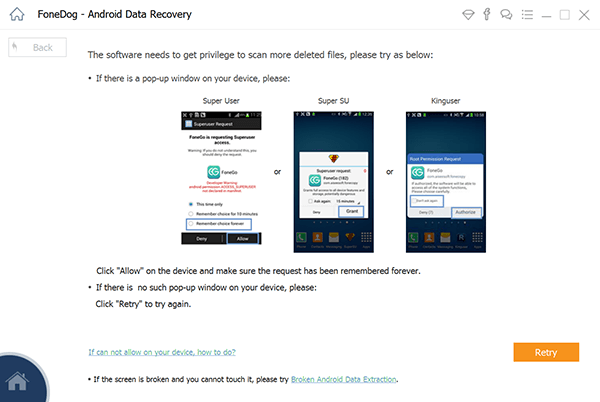 Todo lo que necesita hacer es ir a su dispositivo Android y podrá ver una ventana emergente. Simplemente toque "Permitir" o "Otorgar" o "Autorizar" en su pantalla. Esto es para la herramienta de recuperación de datos de Android FoneDog para extraer todos sus contactos eliminados de su dispositivo Android. Si no pudo ver ninguna ventana emergente en su pantalla de Android, simplemente continúe y haga clic en "Reintentar".