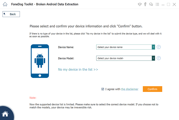 Una vez que FoneDog Toolkit ya haya detectado su dispositivo, haga clic en "Extracción de datos de Android rota".