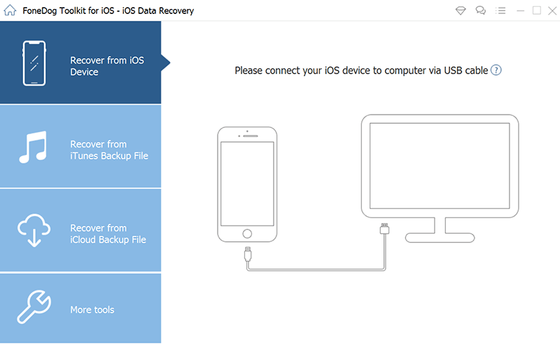 En su computadora (Windows o Mac), descargue Recuperación de datos de FoneDog iOS desde su sitio web y comienza a instalarlo en tu computadora. Una vez completada la instalación, ejecute el programa hasta que aparezca la ventana principal. Puede seguir las guías en pantalla para la instalación. En la pantalla de inicio del programa, haga clic en "Recuperarse del dispositivo iOS.