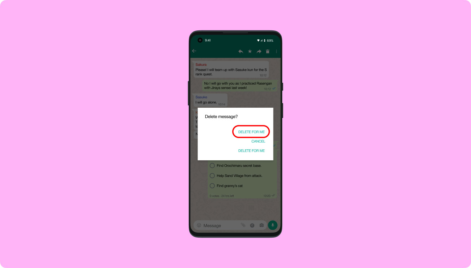 Luego, los pasos a continuación son para situaciones en las que desea eliminar chats o mensajes en un chat grupal.