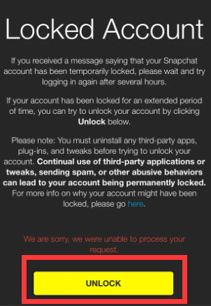 El siguiente paso es presionar el botón desbloquear en la interfaz de la página en la que acaba de iniciar sesión. Este botón Desbloquear se puede encontrar en la parte inferior de la interfaz. Es un amarillo botón. Si Snapchat ahora le permite desbloquear su cuenta, se mostrará un mensaje que indica que su cuenta ya está desbloqueada. Sin embargo, si el tiempo transcurrido aún no es suficiente, tendrás que esperar algunas horas o días.